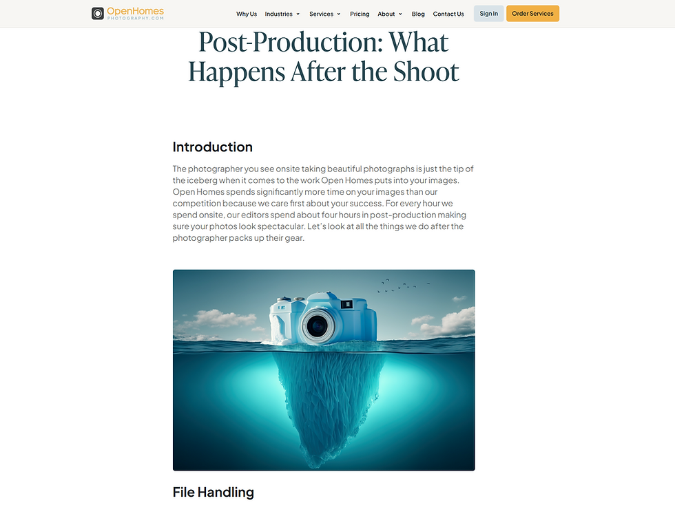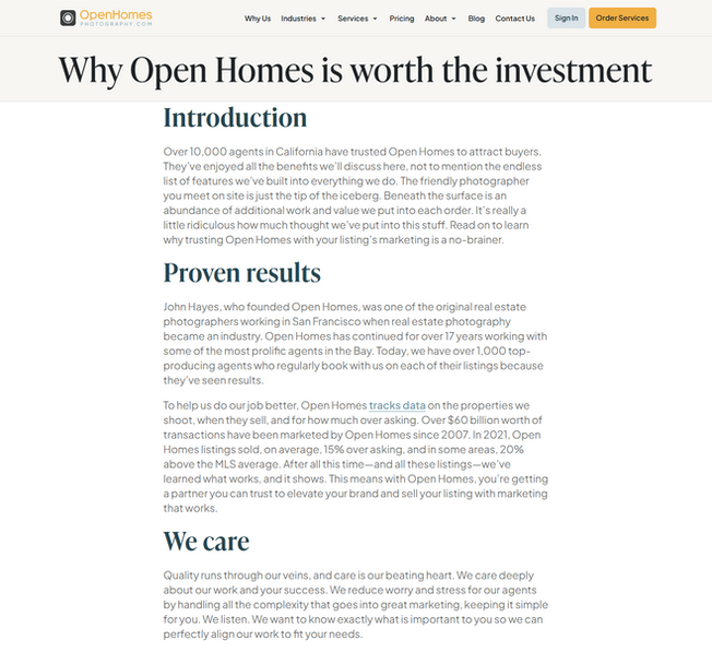 Result: Saved over $20,000 per month on post-production costs, with faster turnaround and better quality. Completed style guides essentially containing the entirety of "The Open Homes Way" which were used in training and new hire orientation. Customer service team was trained on a more advanced approach to service focused on providing customer-tailored services rather than pushing ready-made solutions.